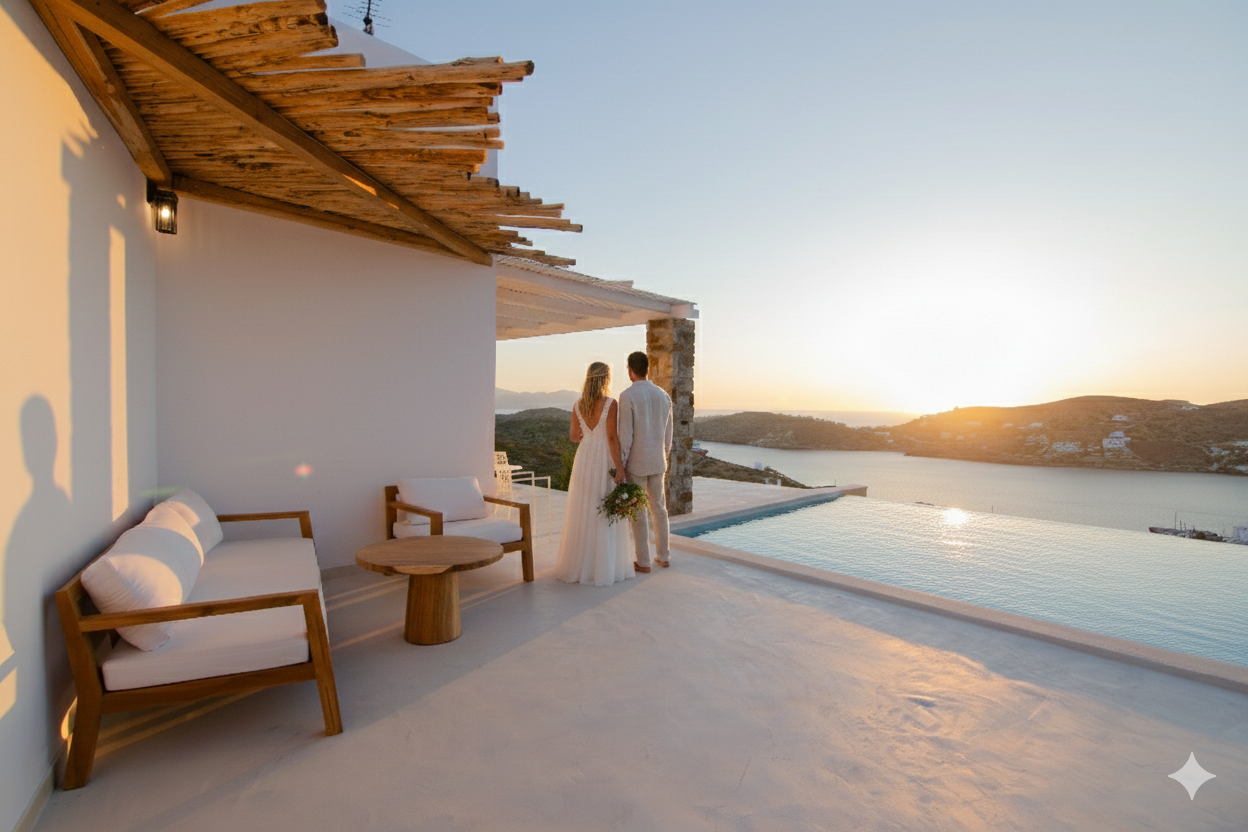 Perched high above a charming sun-kissed harbor in the Greek islands, this stunning villa commands sweeping views of the western horizon, where the sun melts into the sea in a blaze of gold and rose. Whitewashed walls glow in the evening light, while terraces lined with bougainvillea cascade toward the port below, where fishing boats and elegant yachts drift in quiet rhythm. Designed for unforgettable gatherings, the villa offers expansive courtyards, panoramic balconies, and beautifully landscaped grounds that provide an idyllic setting for weddings, celebrations, and special events. As twilight settles over the water and the lights of the harbor begin to shimmer, the atmosphere transforms into something truly magical—an enchanting blend of romance, elegance, and timeless Greek beauty.